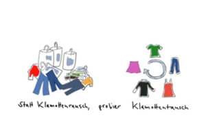 Jede/r kann gute, tragbare Kleidungsstücke, möglichst mit Bügel mitbringen. (Frauen-, Männer- und Kinder-Bekleidung und Accessoires wie Tücher, Schals oder Handtaschen. Schuhe gehen auch, sollten aber eher neuwertig sein). Alles wird hin gehängt/gelegt und jede/r darf mitnehmen was ihr/ihm gefällt. Auch wer keine Sachen mitbringt ist herzlich willkommen!!!!